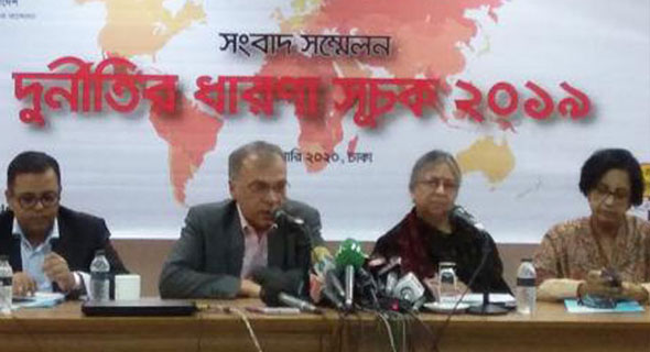 দুর্নীতির ধারণা সূচকে (করাপশন পারসেপশন ইনডেক্স-সিপিআই ২০১৯) ১০০ নম্বরের মানদণ্ডে এবার বাংলাদেশের স্কোর ২৬ , যা গত বছরের তুলনায় অপরিবর্তিত রয়েছে। এই তালিকার ১৮০টি দেশের মধ্যে বাংলাদেশের অবস্থান ১৪৬তম, যা ২০১৮ এর তুলনায় ৩ ধাপ উন্নতি। তালিকায় নিচের দিক থেকে বাংলাদেশের অবস্থান ১৪তম, যা গত বছরের তুলনায় একধাপ উন্নতি। এবছর একই স্কোর পেয়ে বাংলাদেশের সঙ্গে নিম্নক্রম থেকে একই অবস্থানে আরও রয়েছে অ্যাঙ্গোলা, গুয়াতেমালা, হন্ডুরাস, ইরান, মোজাম্বিক ও নাইজেরিয়া।