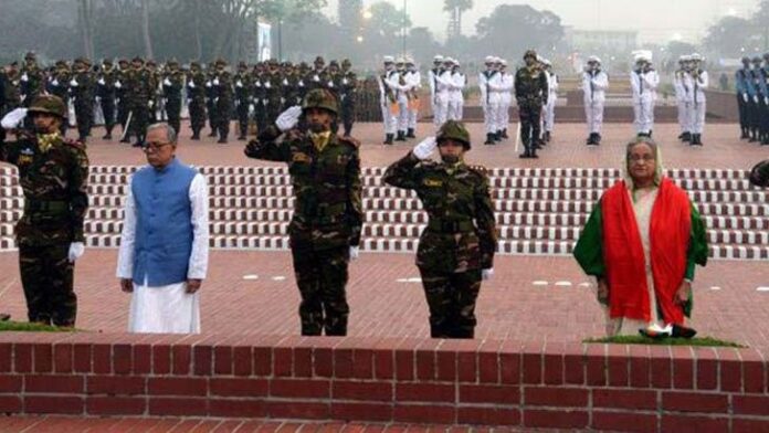 এরপর তারা মহান স্বাধীনতাযুদ্ধের বীর শহীদদের স্মরণে কিছুক্ষণ নীরবে দাঁড়িয়ে থাকেন। এ সময় বিউগলে করুণ সুর বাজানো হয়। পরে স্পিকার শিরীন শারমিন চৌধুরী ও প্রধান বিচারপতি সৈয়দ মাহমুদ হোসেন শহীদ বেদীতে ফুল দিয়ে শ্রদ্ধা নিবেদন করেন।